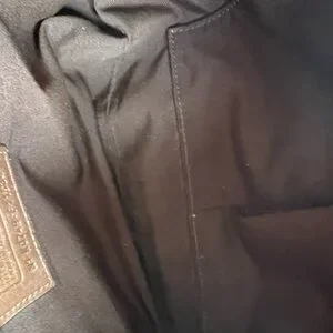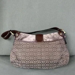 Chic Coach shoulder bag with signature pattern. Features brown leather accents and gold hardware. Ideal for everyday use.