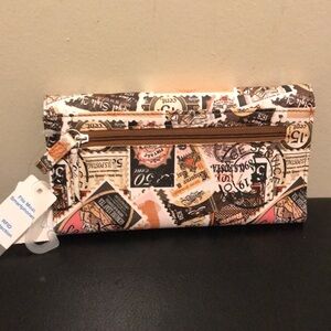 Stylish women's clutch featuring a unique stamp print design. Perfect for adding a touch of vintage flair to any outfit.