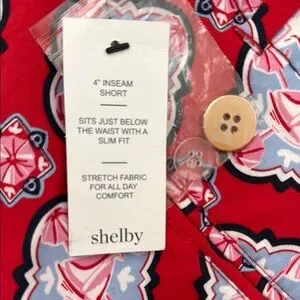 Chic 4 inch inseam shorts with vibrant red and blue coastal patterns. Perfect for a stylish summer look.
