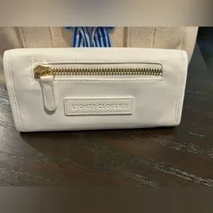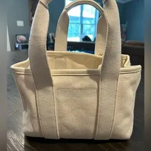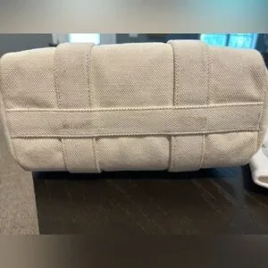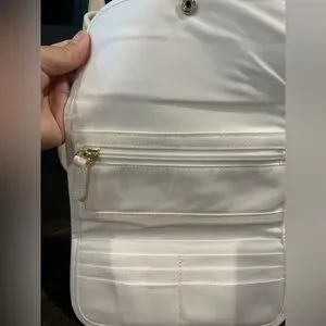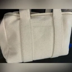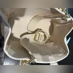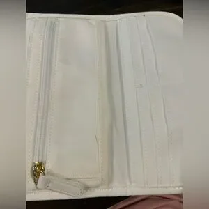 Cream tote with bow (sewn) accent and a white wallet with pink bow (glued). Both have been used and could use a good cleaning. No major flaws.