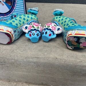 Unique heels with teal and blue heart pattern. Features large bows and whimsical teapot heels. Perfect for a statement look. Hard to find collectors items