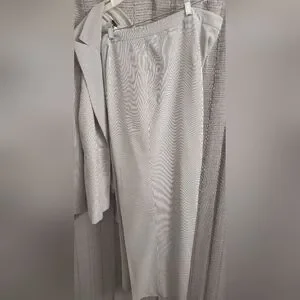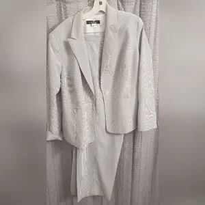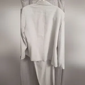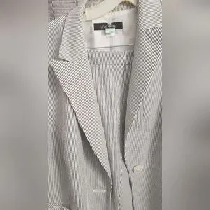 Elevate your wardrobe with this chic women's striped blazer and pany suit. Perfect for professional settings or stylish outings. The classic design and neutral color make it a versatile addition to any closet. Gray & White. 16W. Worn once. Dry Cleaned.