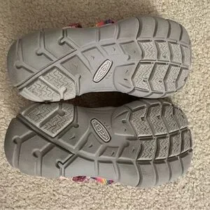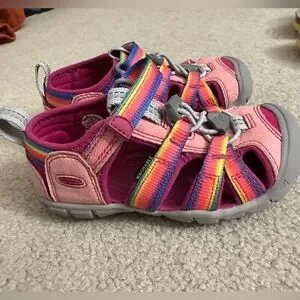 These Keen sandals boast a vibrant pink hue complemented by multi-colored straps, offering a playful yet functional design. With a sturdy rubber sole and adjustable straps, they provide excellent traction and a secure fit, making them perfect for outdoor adventures and water activities.