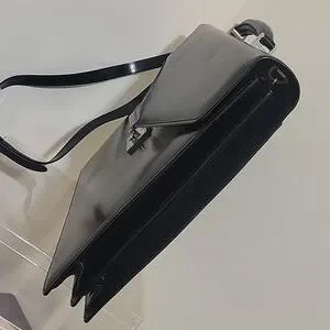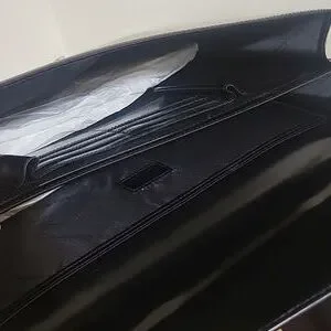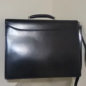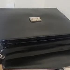 Elegant black leather briefcase. Features a sleek design with a secure silver clasp. Perfect for professional use.