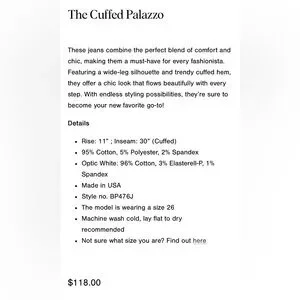 “These jeans combine the perfect blend of comfort and chic, making them a must-have for every fashionista. Featuring a wide-leg silhouette and trendy cuffed hem, they offer a chic look that flows beautifully with every step. With endless styling possibilities, they're sure to become your new favorite go-to!”