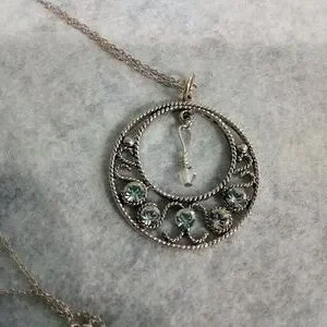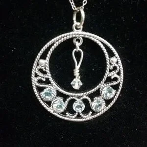 Beautiful 1 1/4" inch round silver tone pendant has 5 beautiful swarovski crystals accenting the bottom of the pendant with filagree silver tone metal surrounding them. A clear bicone shape swarovski crystal hangs from the center to give it a nice motion. The pendant hangs from a 18" dainty chain hallmarked .925 sterling silver. This beautiful necklace will go with any outfit, whether it's a casual day with jeans, dress suit for the office, or going out for a night on the town. These crystal's shine and shimmer like diamonds!