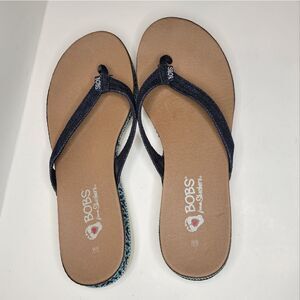 Skechers Bobs Sunkiss Star Fish Sandals, Find your beach party in style and comfort with the Skechers BOBS Sunkiss - Star Fish sandal. Soft woven denim fabric upper in a casual comfort flip flop thong sandal with stitching accents. Patterned fabric accented midsole.