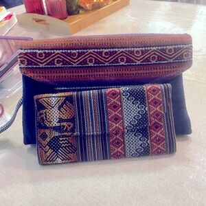 Stuffed handmade clutch bag from Bolivia. Includes matching wallet and various beauty products and a Bolivian little girl magnet. Perfect for adding a pop of color to any outfit. Clutch Bag is 10” x 6 1/2” wallet is 8” x 4 1/2”.