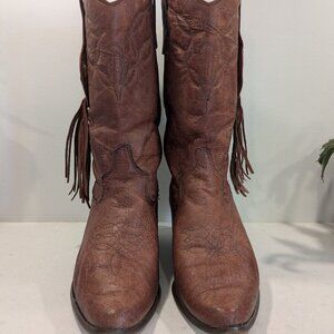 Beautiful cognac brown leather pull on cowboy boots with fringe detail.