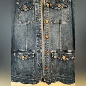Stylish denim jacket! Missing the belt, but there are belt loops on the jacket. In great condition, i’d say this item runs big, i’m normally a M and this is XS.