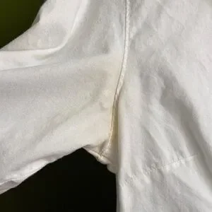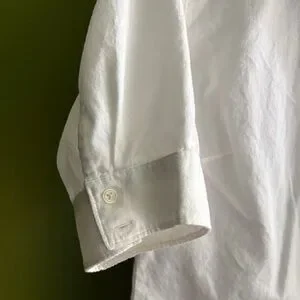 Stylish white button-down shirt. Features a classic collar and chest pocket. Ideal for casual wear. There is some staining under the armpits, however, with proper treatment it should likely come out. Great piece to dress up or down! Comes from a smoke and pet-free home!