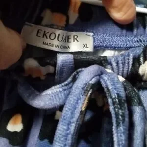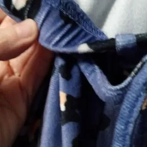 Cozy up in this stylish soft blue velour pajama or lounge set featuring a chic leopard print. The colors are blue, peach, white, and black. Perfect for a comfortable night's sleep or just lounging around the house. I've even worn the top out as a casual top. This long sleeved pullover top has ribbed trim at the crewneck with a front ribbed V, ribbed cuffs, and a ribbed bottom band. The jogger style pants have an elastic waist, with a drawstring closure that's plenty long enough, two slash pockets, and knit ankle cuffs. The top's PTP is 25" and stretches up to 30" across with the center back length at 25". The pant's waistband is 17" across and stretches up to 30" across. The inseam is. 31".