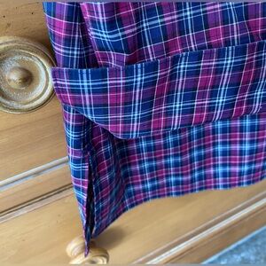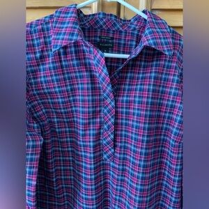 Talbots wrinkle resistant cotton, 2 button placket, Henley collared blouse with turned up and buttoned cuffs, straight hem with side vents. A deep red, navy, black and white plaid: the next to last photo depicts most accurate color. Size 16. Like new! Non smoking and pet free home. P2P 24” 2” below pit on on seam, Shoulder to hem 28”