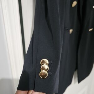 This sophisticated blue blazer features a classic double-breasted design, perfect for any professional setting. Its sleek style and timeless color make it a versatile addition to your wardrobe.