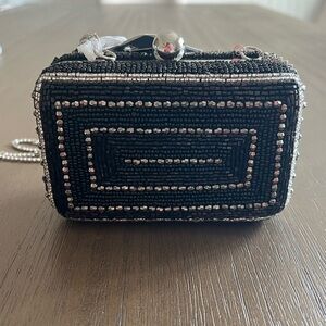 Unique beaded camera-shaped clutch with a chain strap. Features black and silver beads.