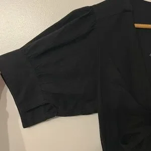 Features: Button-front design, knotted bust detail, subtle puffed sleeves, ruching throughout