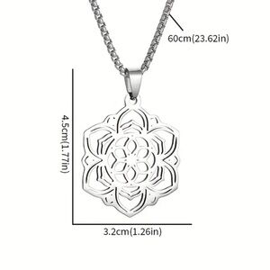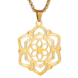 Elevate your look with this elegant gold lotus mandala pendant necklace crafted from durable 18k gold-plated stainless steel. The intricate cutout design symbolizes balance and spiritual growth, making it a meaningful gift or personal keepsake. Tarnish-resistant and hypoallergenic, perfect for everyday wear or special occasions. Chain 24”