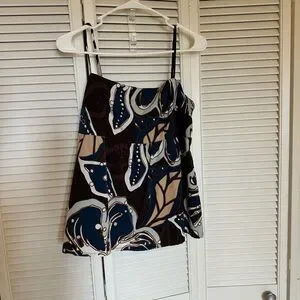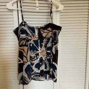 Chic camisole with adjustable straps in bold blue and brown design. Ideal for versatile styling. Dress up with a jacket or a dress down with jeans. Stellar condition.