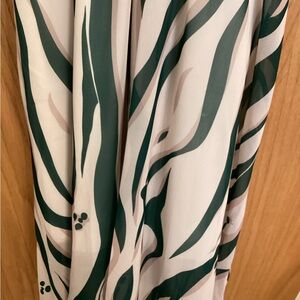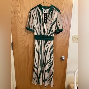 Elevate your style with the Green and Cream Striped Dress. This elegant piece features. Pearl buttons on the sleeves. Satin trimmed sleeves, neckline, top of shoulders, and belt.