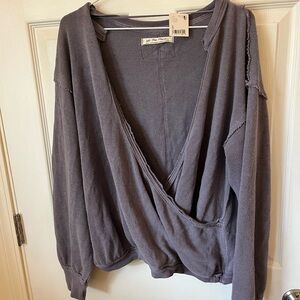 Chic charcoal wrap blouse with a deep V-neck. Features a relaxed fit and distressed details. Ideal for casual wear.