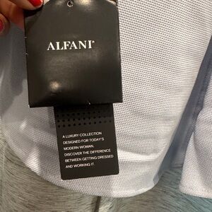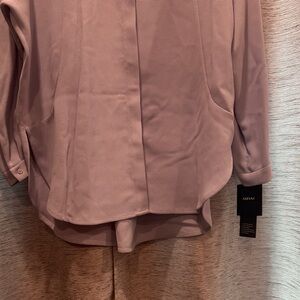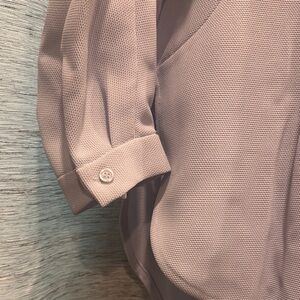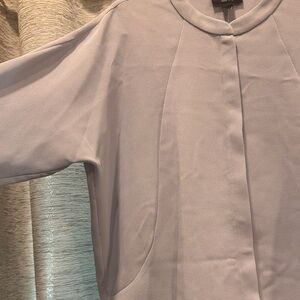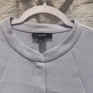 Chic light blue top with textured fabric. Features a round neckline. Longer at back. Runs bigger.