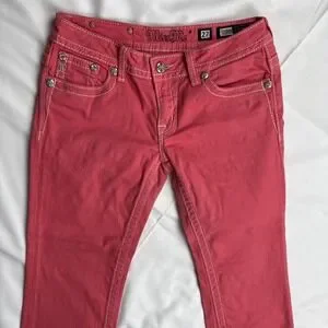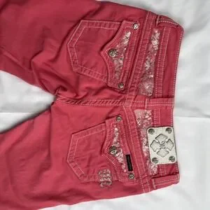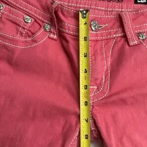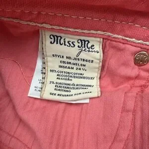 The product is a pair of Miss Me Jeans in women's size 27, featuring a stylish copped length with flap pockets and rhinestone accents. Made of denim with a comfortable stretch, these jeans have a low rise and a 5-pocket design. The color is a melon hue, with a medium wash and zip and button closure. The brand, Miss Me, is known for its American theme and quality craftsmanship, making these jeans a luxurious and trendy addition to any wardrobe.