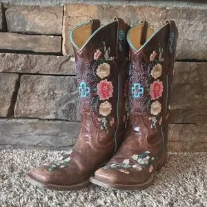 Stylish Macie Bean cowboy boots featuring colorful floral embroidery. Perfect for a trendy western look.