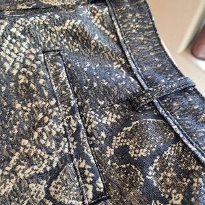 Gold and black metallic snake skin trousers cropped and fit lower on the waist not high waisted pockets at sides and back these are fully lined crisp ironing down legs. (I forget what this is called) beltloops