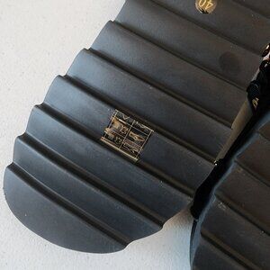"NEW" Fantastic Black Leather & Textile Sandals By Sandro. Adjustable Velcro Strapping/Closure, Molded Cushioned Foot Bed, Multi Colored Braided Accent with Cushioned Heel Strap, Rubber Grip Soles, Gold Tone Hardware & Logo, New, Never Worn, Only Tried On:) Rt.345.00 approx. Size 40/ Chart 9.5-10, Foot Bed Measures 10" for Reference. * The Go with Everything Comfortable Sandal.