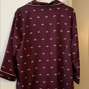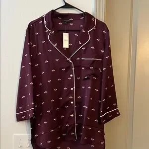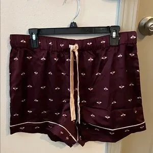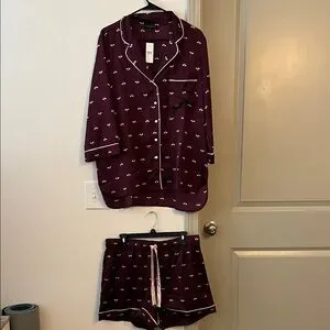 Chic plum pajama set with white piping. Button-up top and matching shorts. Comfortable and stylish for bedtime.