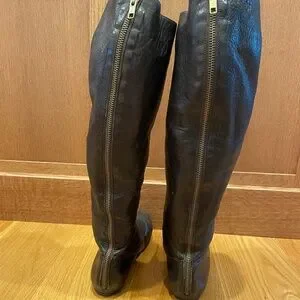 Lanvin brown leather boots, knee high zippers up the back, hidden internal 1" wedge heel. Soft, lightweight, buttery soft leather lined with satin. Front seam, rounded shoe detail as seen in photos. Labeled "Lanvin Hiver 2005" from the Lanvin Winter 2005 collection. In quite good condition, well-preserved, just a few minor scuffs as seen in photos. Possibly resoled (because no size marking found), if so done professionally and perfectly, see photos. Size is 7.5 based on fit. Sourced at a consignment shop on Manhattan's Upper East Side and never worn. #lanvin #y2k #kneehighboots #hiddenwedge #zippers