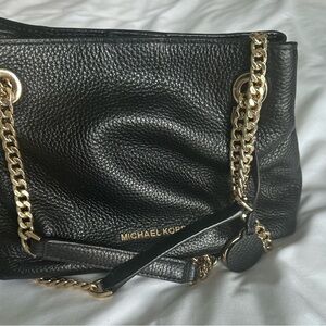 Chic black mini shoulder bag by Michael Kors. Features gold chain details and logo charm. Perfect for any outfit.