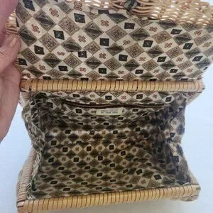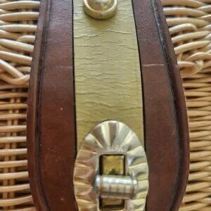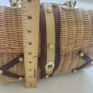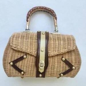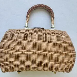 Adorable vintage plastic wicker handbag with lots of rustic charm! Featuring braided handles, leather accents, front turn lock closure, brass accents and a fabric lining. Made in British Crown Colony of Hong Kong.