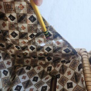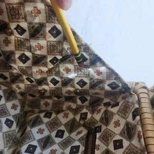 Good used condition - 3 small blue spots on the front flap, cracks in the leather on the front flap closure, 2 spots on the back of the bag where the clear plastic is showing, the interior lining has an hole on the bottom, a few small holes on the side of the fabric, the fabric lining is not attached to the bag on one side at the top, fabric is not attached all the way on the top of the flap. Please see the photos.