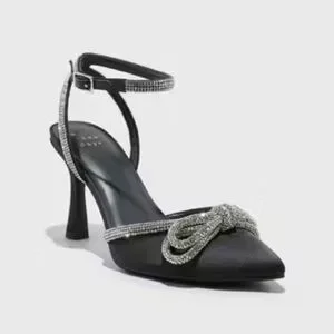 Elevate your evening ensemble with these sophisticated slingback heels from A New Day. Featuring a sleek black design adorned with a sparkling rhinestone bow, these heels offer a touch of glamour and elegance. The pointed toe and thin slingback strap ensure a chic and secure fit for any formal occasion.