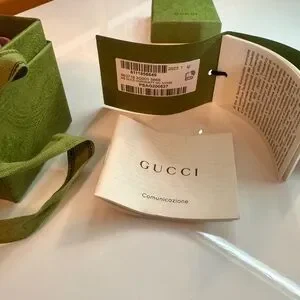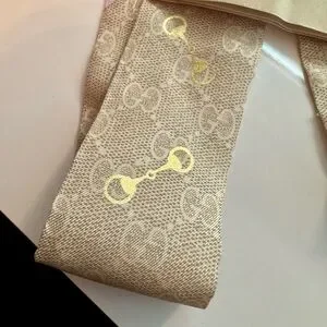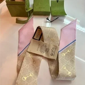 Chic Gucci silk accessory in pink and beige. Showcases signature design. Comes with box and tags.
