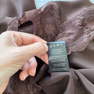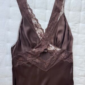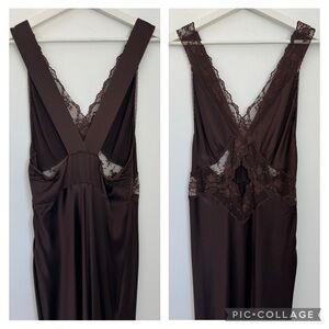 Sir the Label M Aries Cut Out Gown Chocolate Brown Silk Lace. A Chocolate cut out maxi dress featuring contrast floral lace cut-out detail through front to accentuate the waist. Bias cut silk satin softly skims the body. Exclusive to Mytheresa and SIR. Size 2 equivalent to a medium (size chart enclosed), the measurements for the actual item are below. Used in good condition with some minor marks.