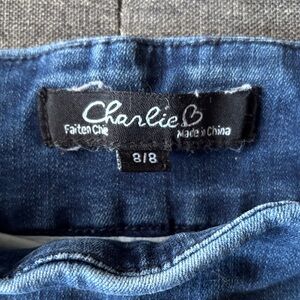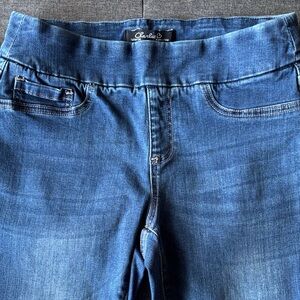 EUC medium wash denim jegging, pull on style with a wide stretchy waistband. Two back pockets and a functional coin pocket in the front with 2 faux front pockets. Whimsical denim bows elevate this denim on the back ankles. Vented and covered in dark blue velvet. Skinny leg.