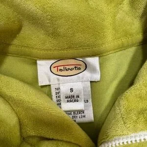 Lime green terry cloth jacket and pants set by Talbots. Soft and stylish for everyday wear. White piping on seam.