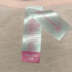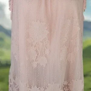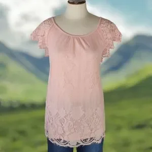 Lovely pink lace top with sheer lace cap sleeves and front lining. All fabric is stretchy for a perfect, comfy fit. Wear her with leggings and boots or pair her with jeans or pants for all-day comfort.