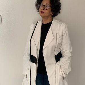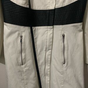 Venus size 12 Vintage look! This jacket will elevate your wardrobe from class to sass! Chalk White sturdy, woven, cotton blend, lined, silver zippers, featuring sleek black leather look accents. So many ways to wear it! Scarf, over romantic ruffled top, jeans, skirt, ! I could picture Michael J or Prince, boots or heels! Open or zipped, so versatile! Let’s PUNK, you ROCK! Catch some 80’s /90’s vibe