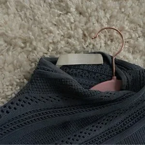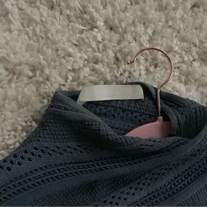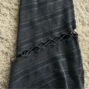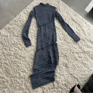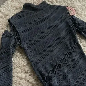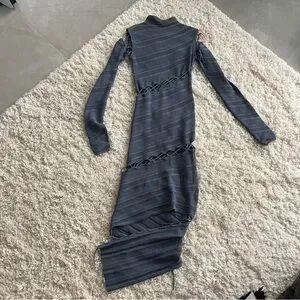 Dion Lee. Slate blue. Crochet knit. Long sleeves. High neck. Lace-up detail that wraps around the body and bottom half of the dress. It’s minimal but with that unmistakable Dion Lee touch — modern, textured, a little unexpected. Made from a luxe viscose-blend yarn with stretch rib knit panels, it’s the kind of dress that works for both effortless daywear and elevated nights out.