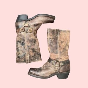 Gorgeous chocolate brown distressed leather frye moto leather boots in a women's size 8.5 perfect color and style for the season