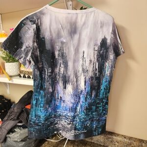 Explore urban elegance with this abstract cityscape women's top. Featuring a blend of black, blue, and gray hues, this top is perfect for a modern look.