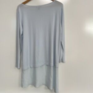 Elegant Eileen Fisher 100% silk top, women’s size medium. Features a soft blue color, long sleeves, and a layered hem design for a modern, flattering silhouette. Lightweight and luxurious, perfect for both casual wear and dressed-up occasions.