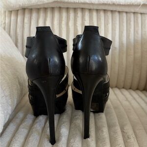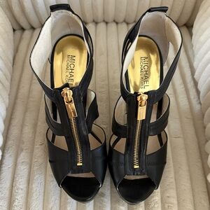 MK super sext black heels with gold insole and hardware accents. Size 7.5. Wore these a handful of times, they are extremely flattering with any outfit and pretty comfortable for high heels. The zipper is functional. These are in EUC with only very minor flaws. Close-up photos of all angles provided. I did not save the box. Smoke- free home.