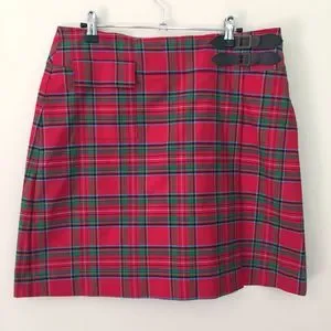 Vibrant plaid mini skirt. Features red and green pattern. Stylish buckle details.