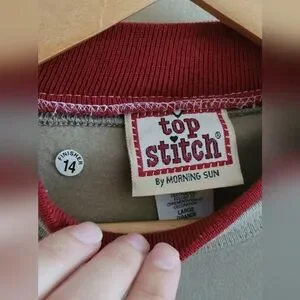 Vintage Top Stitch by Morning Sun cotton and polyester blend pullover sweatshiet with faux layered collar look. Embroidered birds and birdfeeders decorate the front.