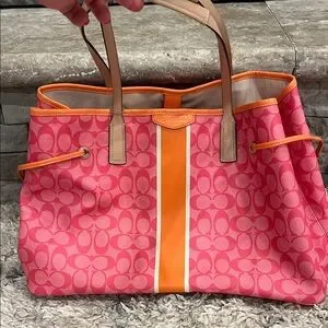 Eye-catching Coach tote with signature pattern. Bold pink and orange colors. Ideal for daily style.