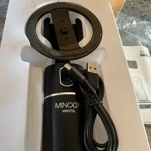 Capture stunning videos with the Minolta black video camera, featuring a convenient smartphone mount for easy recording. Free your hands while recording or video chatting with this face tracker. It uses an expandable smartphone mount, AI camera and 360-degree horizontal rotation to track your face, allowing it to automatically follow your movement to keep you centered in the shot.